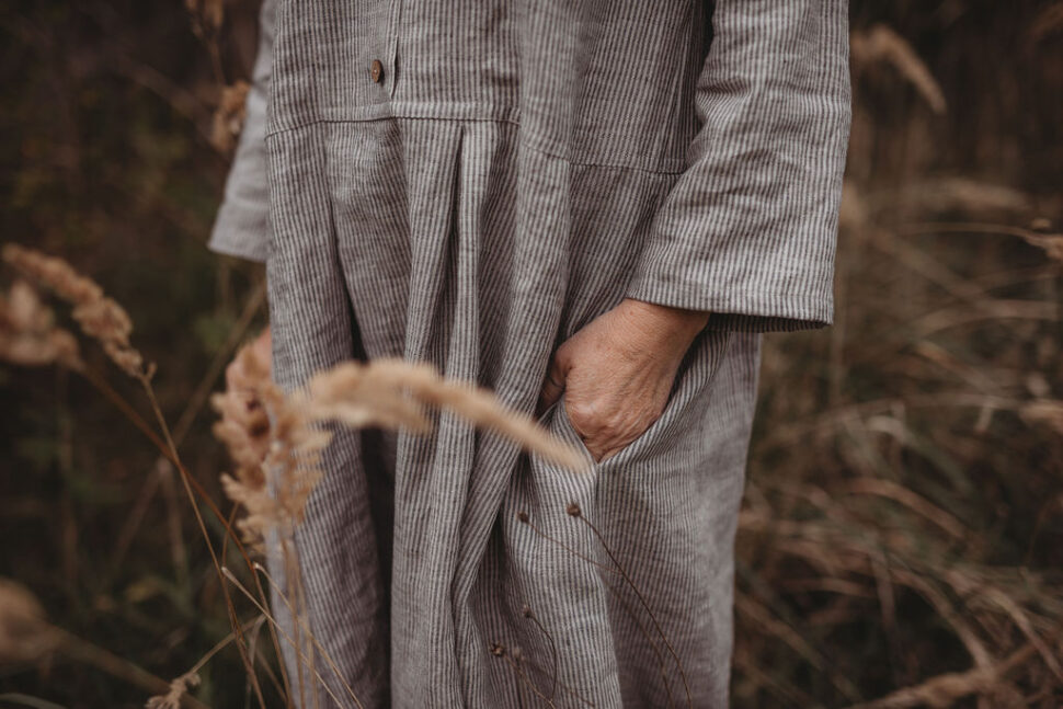 Třeba takové šaty Josefína – kvalitního lnu, bez pár centimetrů, čítá 3 metry. Jeden metr plusminus 450,- Kč. K tomu nějaká ta výztuž, nitě a pár knoflíků. Matroš sumasumárum celých čtrnáctset.